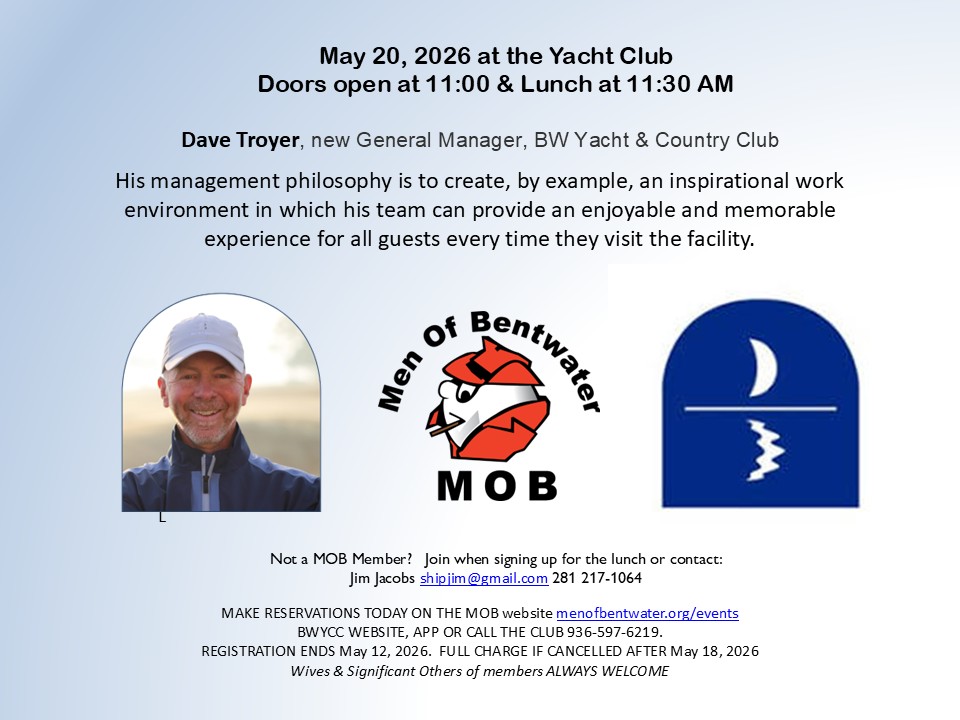 May 20, 2026 11am - 1pm - MOB Luncheon - Dave Troyer - Bentwater's New Country Club GM at the Yacht Club